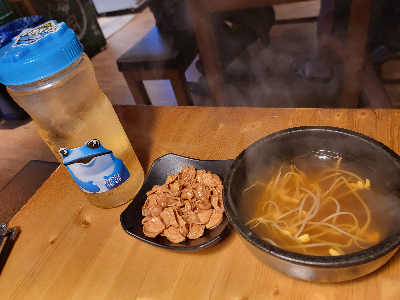 이곳은 기본안주로 소라과자랑 콩나물국을 주시는데 얼마만에 먹어보는 소라과자인지 ㅎ 신나서 먹다보니 술이 나오기도 전에 흡입 ;; 콩나물국은 얼큰해서 국한나로 소주한병 뚝딱! 할수있겠더라하구요!!