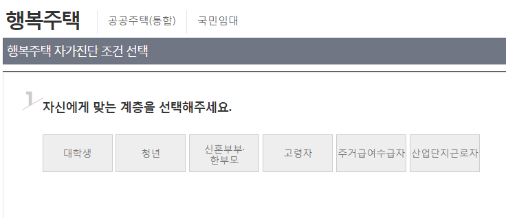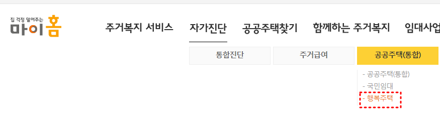 마이홈 홈페이지접속 ▶ 자가진단 ▶ 공공주택 ▶행복주택 ▶조회