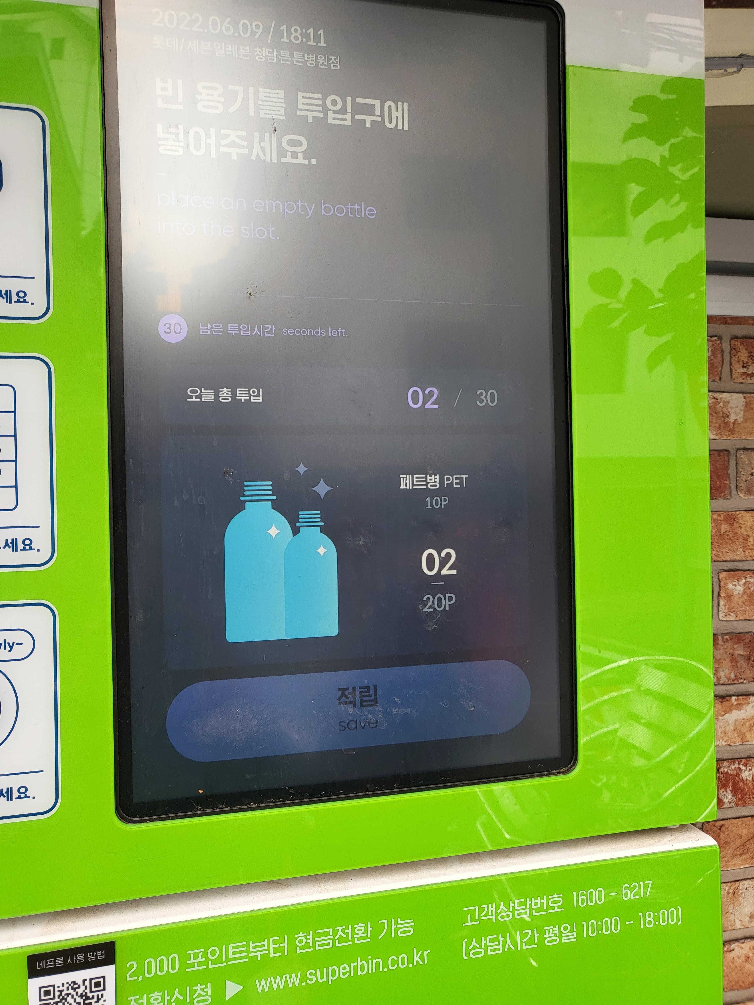 6. 내가 준비한 페트병을 다주입하셨다면 화면에 적립버튼만 누르면 완료!!
